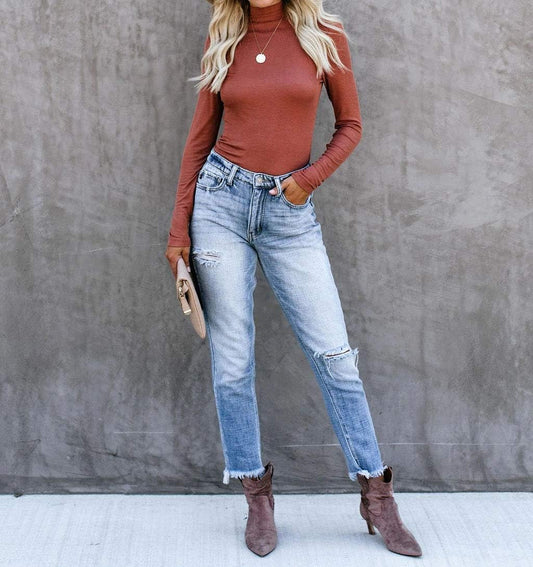 Fall 2025 Women'S Mock Neck Long Sleeve Tops Pleated Wrap Waist with Metal Buttons Stretch Slim Fit Shirts
